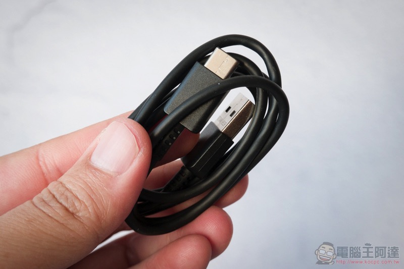把手機拿開,可以看到標準的配件,包括:3.5mm 耳機、USB-C 傳輸充電線以及充電器 -- 有發現嗎?配件也與手機顏色相同耶(不過晶礦藍的配件也是白色的就是了):