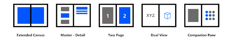 Microsoft 在雙螢幕的願景方面,希望能夠讓應用程式在雙螢幕設備上達成如下圖的五種顯示方式。預設情況下,你的應用將使用單一螢幕,但是當設備依照需求橫向或直向擺放時,應用程式可以跨越兩個螢幕來顯示,依照開發者的規劃,多元的運用方式將能帶來更多應用程式的可能性。