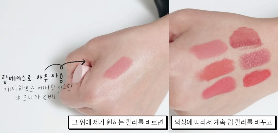 唇膏上同樣也是以顯氣色、提氣質的玫瑰豆沙色為主(下左圖)!而南韓的世理因為有著比較多變化的穿搭,因此口紅顏色會盡可能地與服裝做呼應,先以MLBB豆沙色為基準,再調配出其他不同變化的唇色(下右圖)。