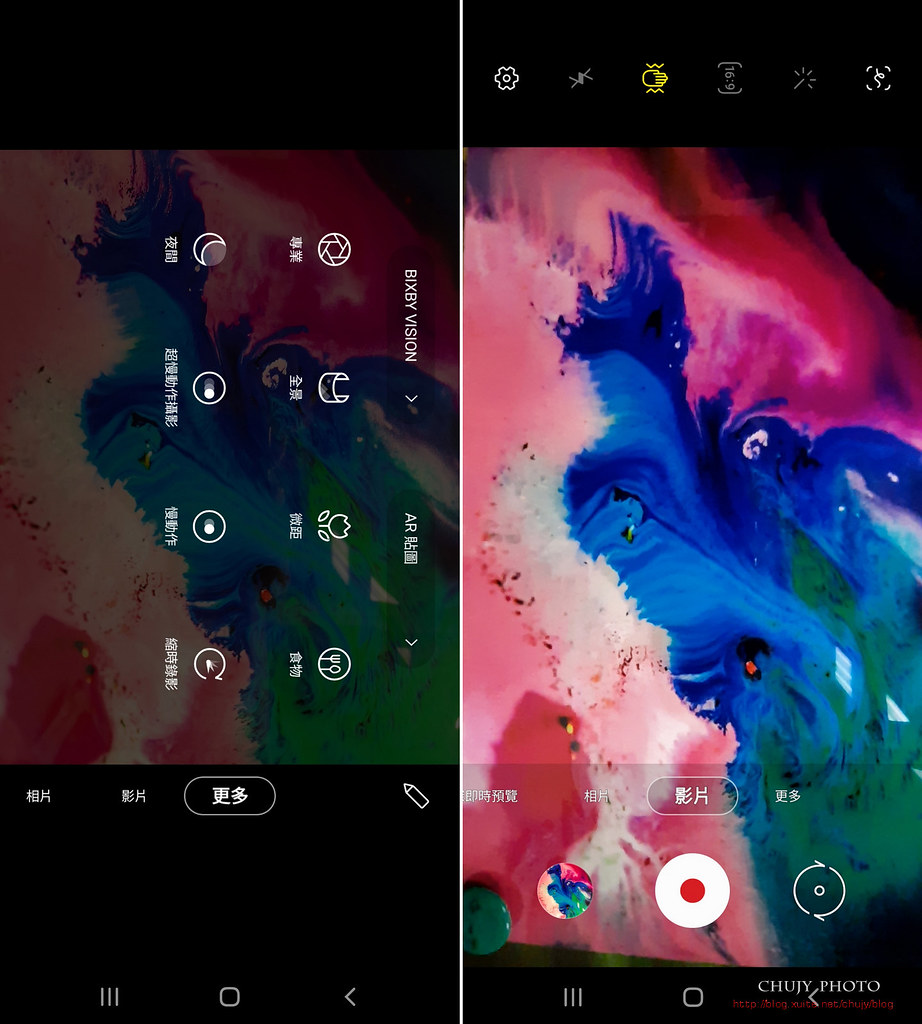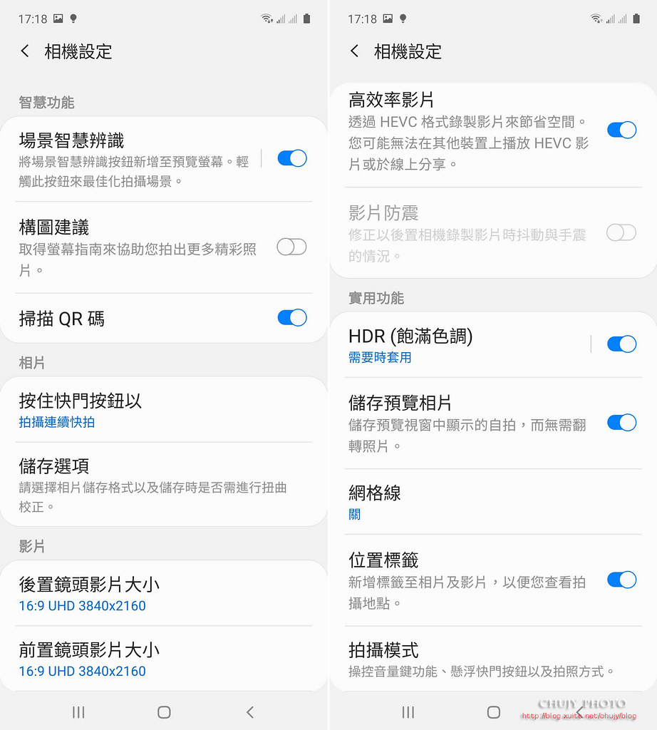 相機設定基本上承襲 Samsung 一貫的 One UI 2介面,都能在此處看到相對應設定。前後鏡頭影片都能支援到 UHD。