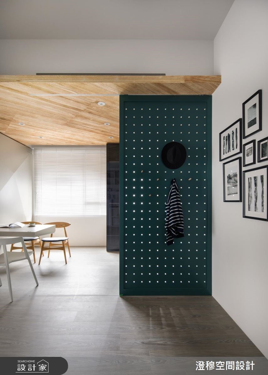 大部分住宅玄關本身面積不大,因此座落於此的一日衣櫃設計主要分為三大類型。第一種是近幾年相當受歡迎的「洞洞板收納」。一次可容納各式品項的收納特性,成為一日衣櫃愛用的設計概念之一。加裝簡易的掛鉤與層板,即能滿足包包、衣帽的收納需求。現在也發展出多元的洞洞板材質,透過質材本身特性與跳色的創意,常為室內帶來亮眼的第一印象。