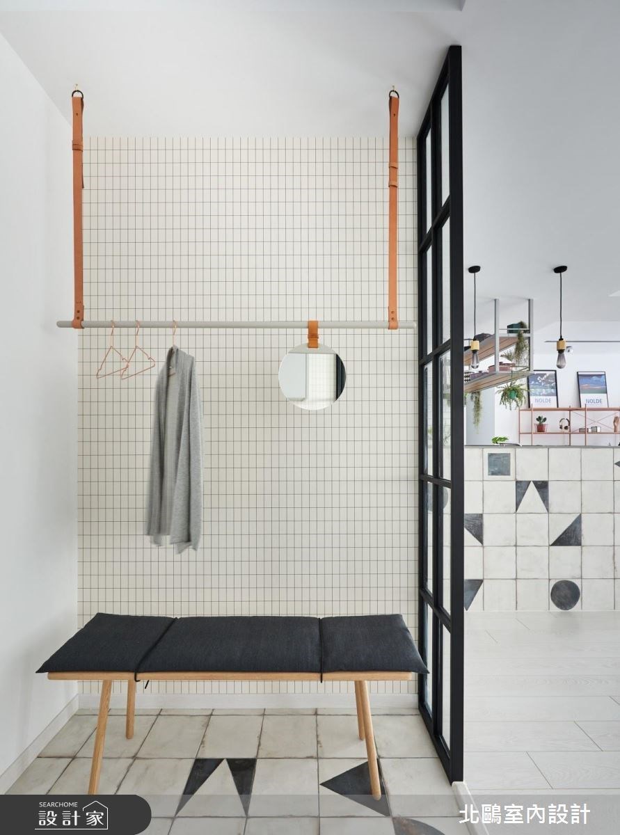 第二種設計主要概念是在穿鞋椅上方牆面,安排收納桿、掛鉤或層板,打造出一處便利的整裝區。此種設計著重於收納架或五金配件的挑選,如鐵件與皮帶式掛鉤的選配,創造了耳目一新的視覺效果;又或者利用多餘的掛鉤,吊掛鏡面、植栽的巧思,皆賦予玄關專屬個性。