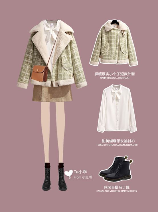 別以為腿型不好看就不能穿短裙,拉長身高比例。其實善用襪子與鞋子做搭配也是個不錯的選擇呢!像是這樣利用短裙搭配膝上襪,再搭配一雙同色系的靴子,不但可以利用暗色系來改善肉肉的視覺感,唯一露出來的大腿部分則顯得非常纖細。至於下半身的靴子可以挑選有跟款,這樣看起來會又高又瘦喔!