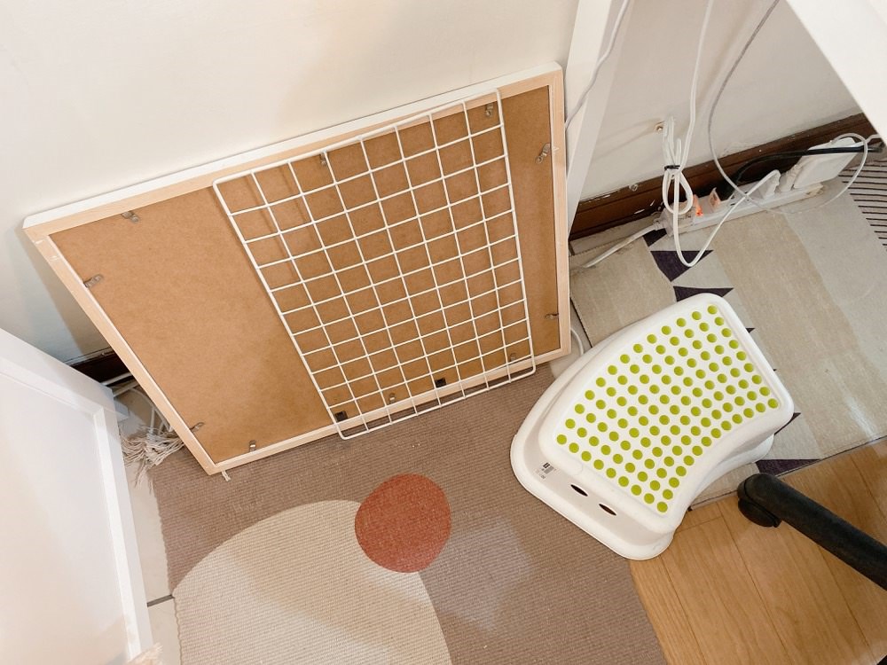 不少租屋族應該都會遇到房間插座不夠,或是插座位置不對的問題,導致需要使用延長線來滿足日常用電需求,像是星星就分享她的房間只有兩個地方有插座,因此必須使用延長線、電線也會拉比較長,結果破壞了整個居家的美感。有鑑於此,她在有電線會露出來的地方,都利用素面的畫框加上地毯來作修飾,一方面不影響美觀,另一方面也便於日常用電。
