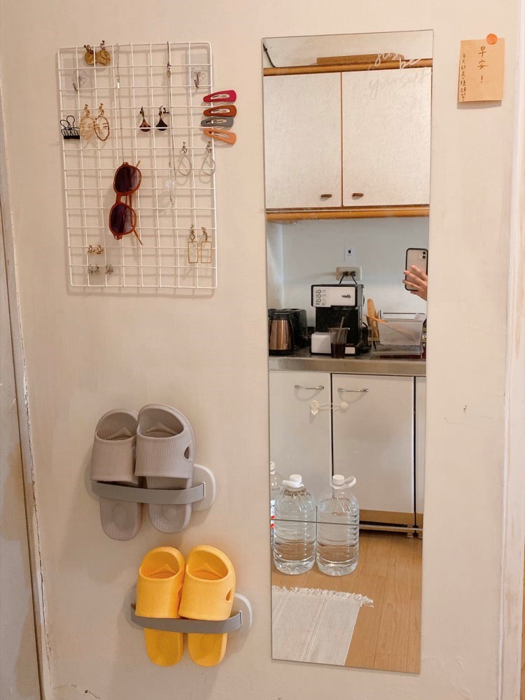 貼鏡旁的大創網架則可以收納耳環、太陽眼鏡等飾品,出門前能一邊搭配飾品一邊照鏡子,整理完儀容再出門。