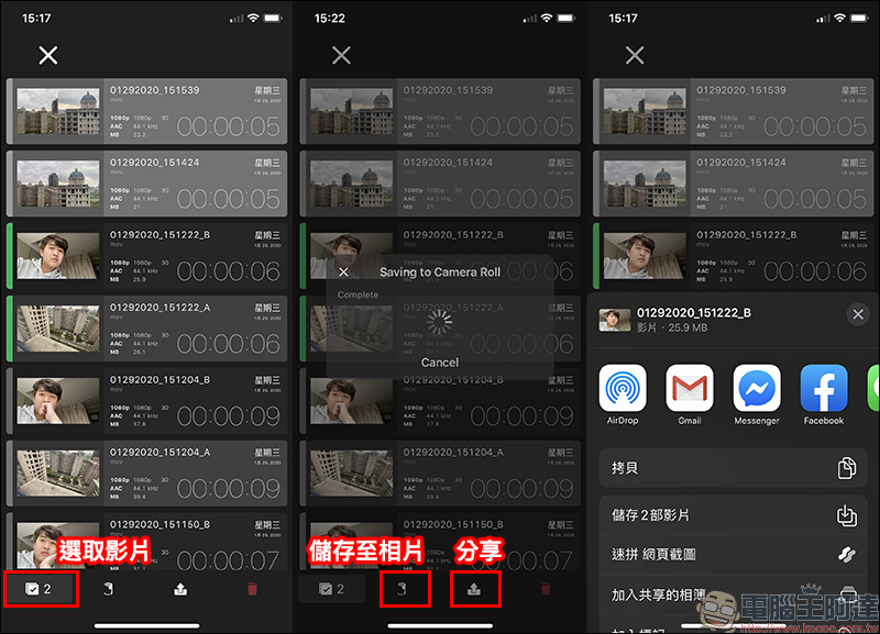 在媒體庫會顯示各段影片的秒數、製作日期、解析度、檔案大小等完整資訊。用戶只要選取想匯出的影片,接著點擊下方的功能按鈕,便可將影片匯出至相片 App 或直接分享至其他平台: