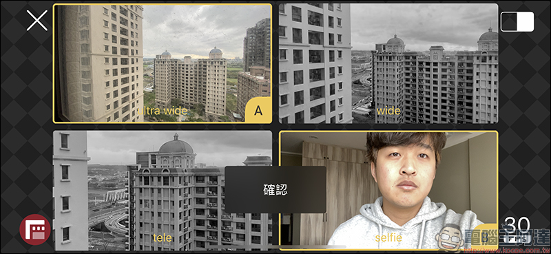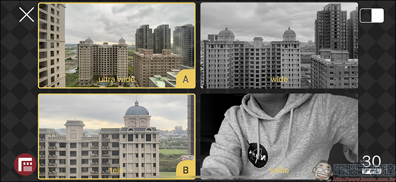 Doubletake App 的操作方式相當簡單且容易上手,首先在鏡頭頁面選擇 A-B 畫面要分別使用哪兩顆鏡頭進行記錄,在配備三鏡頭主相機的 iPhone 11 Pro 和 iPhone 11 Pro Max ,用戶可選擇包括後相機的超廣角鏡頭、廣角鏡頭、長焦鏡頭以及前鏡頭相機。在同一頁面內也能設定影片幀率,提供 24FPS 、 25FPS 或 30FPS 的幀率。錄影解析度未支援 4K 選項,皆以 1080p 進行錄製。選擇好鏡頭後,按下確認便會返回錄影主畫面: