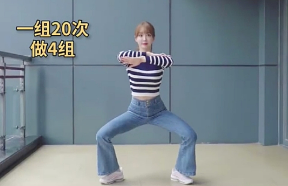 將雙手搭起、平抬至與肩膀成水平高度,下半身則將雙腳打開、呈現蹲馬步姿勢。