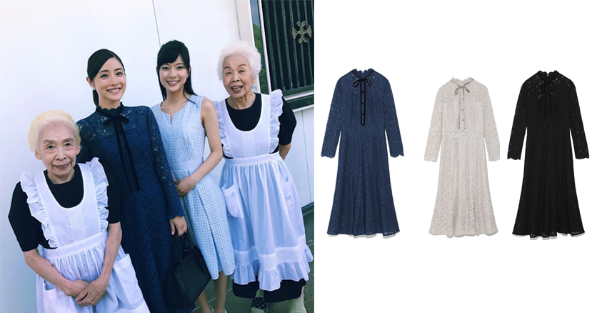 除了上一件白色連衣裙,石原在劇中的第2集又穿上了CELFORD的衣服,她穿得這件藍色蕾絲聯衣裙一樣有個可愛的小高領,不過胸前卻多了天鵝絲絨的藍絲帶,有畫龍點睛的效果,讓這條連衣裙多了一些巧思!雖然石原只有157cm,但是這條過膝的裙子反而修飾了她的身材,變得更修長勻稱。