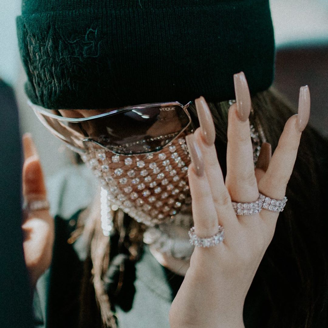 除了亮片薄紗款式之外,超愛Bling Bling鑽飾的Billie Eilish當然也不會放過,在口罩上點綴水晶鑽飾的機會,只見她以膚色口罩為基底鑲滿整齊排列的數十顆鑽飾,就連平常掛在耳朵上的橡皮筋也改以水鑽鍊條取代,呼應手上的鑽石戒指,可說是史上「最不低調」的口罩搭配!
