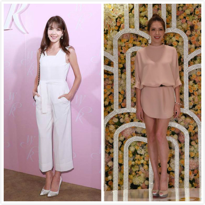 許瑋甯喝喜酒似乎偏愛穿著連身衣,(右)出席陳妍希的婚宴時,梳起俐落的包頭,簡單的連身短洋裝繫上腰帶,看起來腿無限長。(左)參加在林心如和霍建華歸寧宴時,則以帥氣的9分連身褲造型搭配尖頭高跟鞋,俐落又時髦。