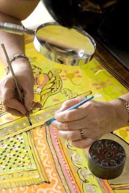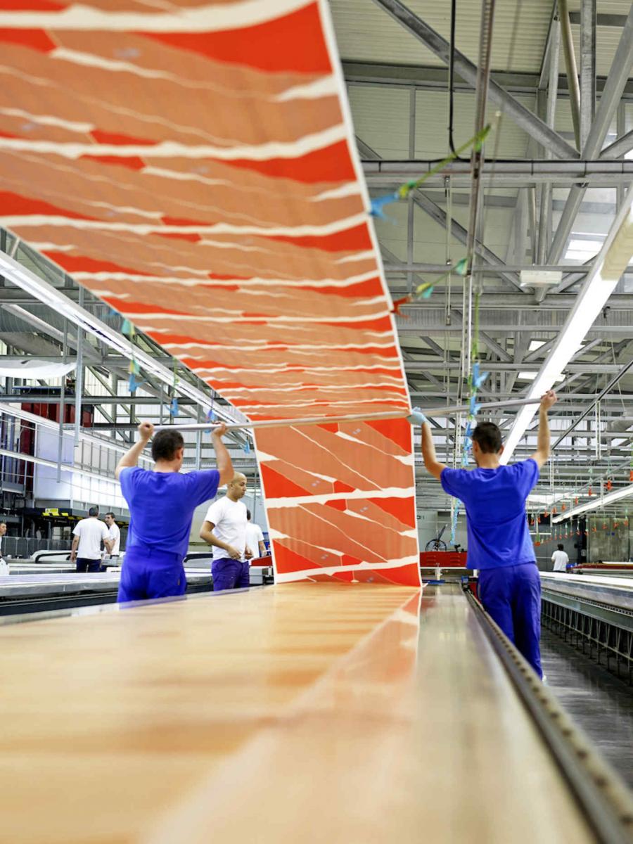 Hermès 每一條絲巾的顏色,都是由里約的調色團隊製成,不假於他人之手,所有的顏色都是 Hermès 工廠中自行生產出來的,調色工藝則是以不同比例的顏料去混合混合天然膠,截至為此,Hermès 的色庫中已經有超過 75000 種不同的色彩。