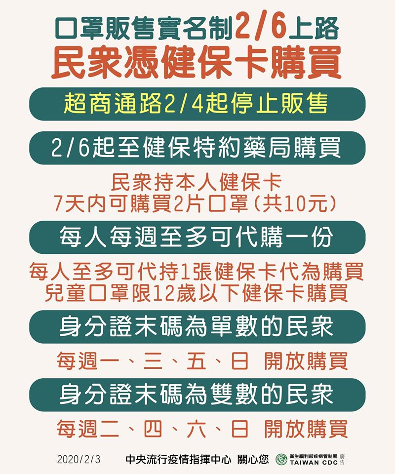 2月6日起實施「 口罩販售實名制 」 7天內限購2片