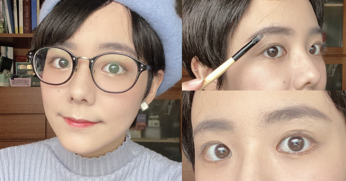 首先,第一大核心就是眉毛!大部分女生在上眉妝的步驟一定比Maureen編還講究,不論是眉峰的高度、眉尾的乾淨俐落感,又或者眉頭的漸層,光化一個完整的眉毛就要花上5分鐘 ~ 不過這樣立體完整的眉妝搭上眼鏡卻會顯得突兀且不自然!想要讓眼鏡成為妝容的一部分,首先眉毛絕對不能搶戲!選擇顏色較清淡的淺灰色、淺棕色眉粉將眉毛空隙填補、雕出大約的眉形即可,若隱若現的眉妝才能扮演眼鏡的最佳配角!