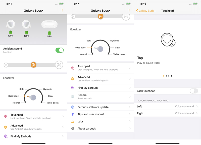 與 Galaxy Buds 相同, Galaxy Buds+ 也能在 App 設定耳機上的觸控板的對應功能,設定後在輕觸並按著觸控板便能在耳機上直接調整播放/暫停、音量調整、環繞音效切換、語音指令以及這次在 Galaxy Buds+ 新加入的 Spotify 控制。