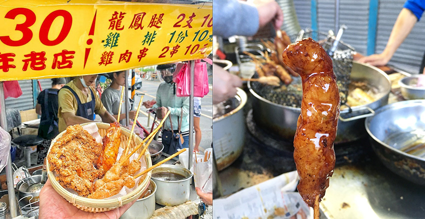 這項傳統小吃,同樣也位於東門夜市內,價錢更驚人,2支只要NT$10。龍鳳腿是以豬網膜油包裹著豬肉、高麗菜等內餡,油炸過後就成為噴香四溢的平民美食。另外雞肉串及雞排也都是NT$10,是不是佛心來著。不過由於上門客人過多,老闆沒時間結帳,這裡採取自助式取餐結帳,醬料有甜辣醬及蒜蓉醬,想沾多少全都自己動手來。