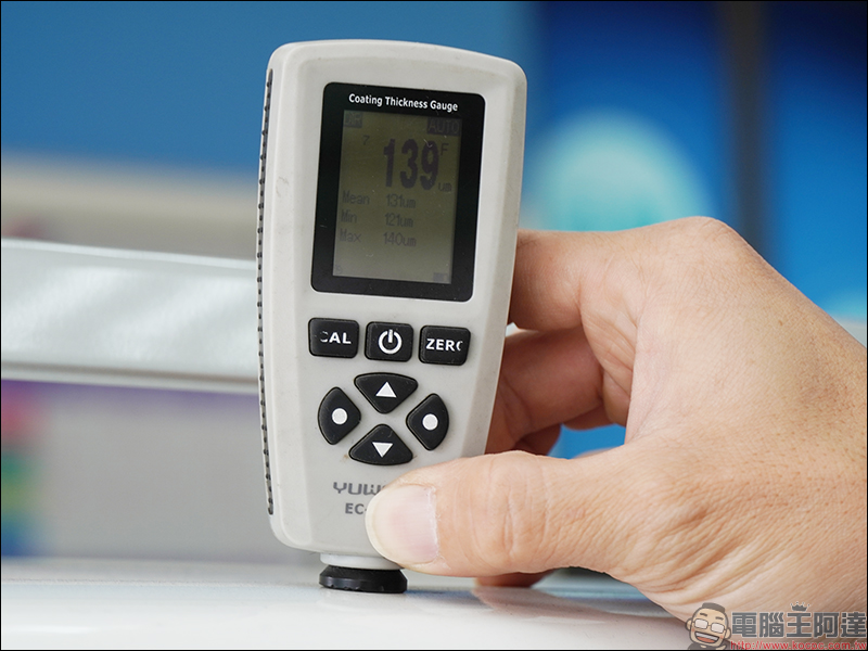 最後是個人認為平時很難見到的測試儀器,它只要放上就能檢測鈑金厚度是否有異常情形。如果誤差值超過一定範圍,代表可能車輛曾有鈑烤的紀錄: