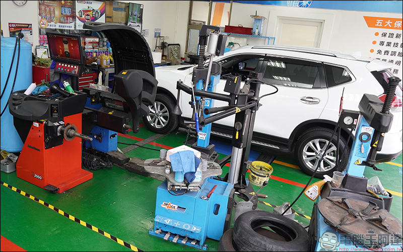 右側那台藍色的是輪胎拆裝機,而左側紅色那台則是 3D 攝影輪胎平衡機,可精準測量輪胎溝深及胎壁是否變形,以及 RFV 值測量: