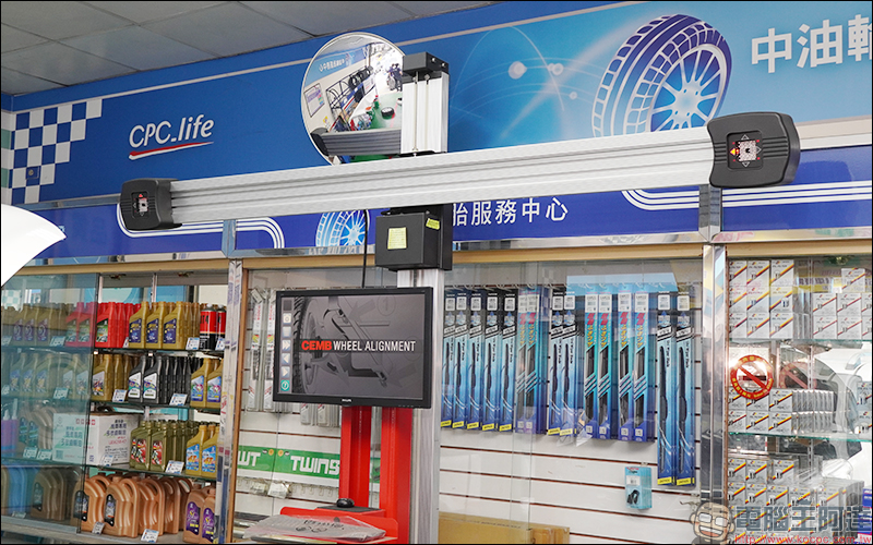 畢竟平時很難看到這些維修專業器材,因此在等待期間也逛了一下現場的設備,像是這台十字的大機器就是 3D 四輪定位機: