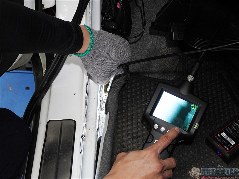 由於多了 Wow!好站的加入,在這也不再像以往的中油快保中心只有汽車保養服務而已。現場剛好遇到一位 SAA 車輛鑑定人員正仔細地為一輛車進行 SAA 鑑定,在鑑測完成後,服務人員也會提供車主一份完整的車輛鑑定報告。現場也看到幾款較特殊的檢測儀器,像是透過內視鏡儀器檢測車內角落是否有水痕,若發現異常也可能代表這輛車可能曾經有泡水情形: