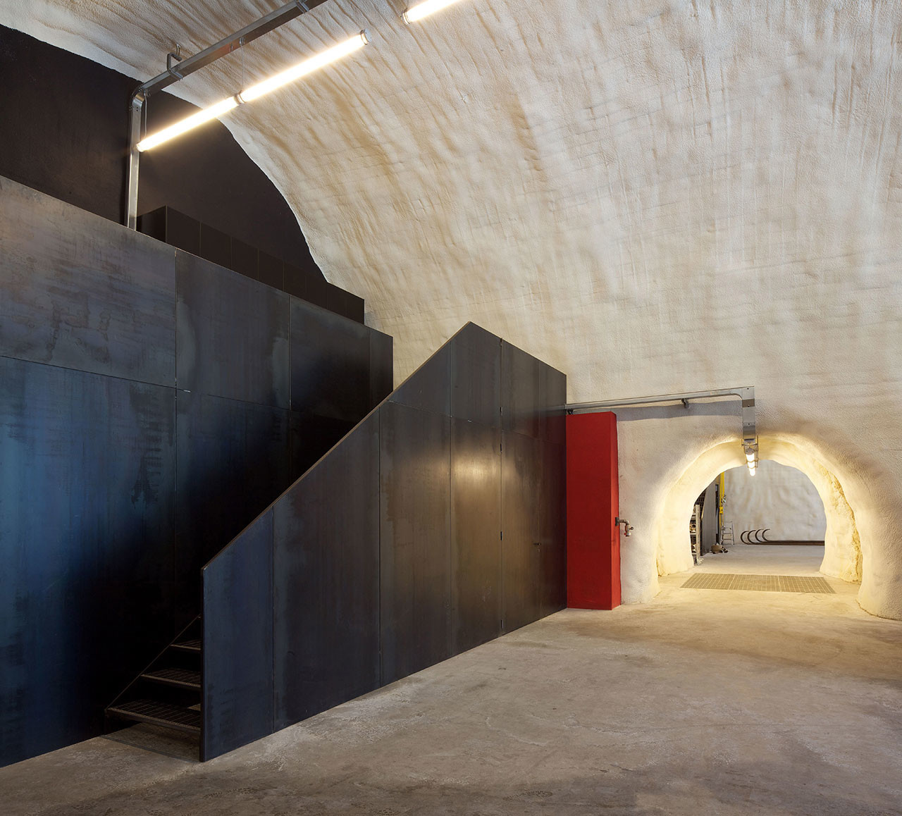 外部距離原始石壁1公尺建立一面黑色水泥牆,除了看起來非常酷也可以當成阻擋落石的屏障。因為建在300英尺高的陡峭岩石峭壁裡,所以有著終年涼爽恆溫的特性。該建築的新穎的設計建築師贏得了四項建築獎。