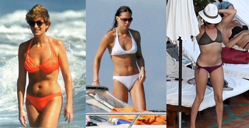 說到「穿太少」這件事,據說英國人民最懷念的王妃「黛安娜」據說曾經因為穿著露太多而被女王碎碎念~最後來看看歷屆王妃們(左起黛安娜王妃、凱特王妃、梅根王妃)的比基尼美照,姑且不論得不得體,重點是、這幾位王妃的身材會不會太好啦!