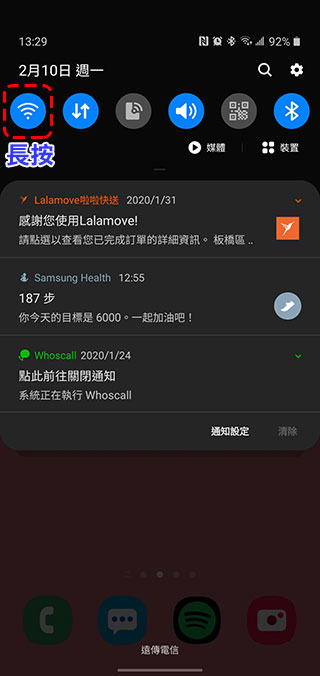 1. 長按下拉式功能表中的 WiFi 圖示進入選擇 WiFi 的介面。