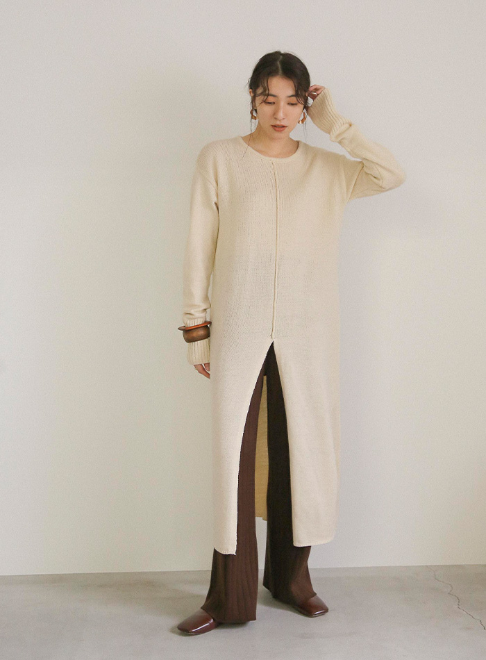 長版針織洋裝簡易的入門穿法推薦以單穿為主,非常適合作為偷懶時的穿著選擇。利用單穿長版針織洋裝的造型表現,快速即擁有簡約的優雅氣質,混搭黑色褲襪還能增加保暖感且製造理想造型度。