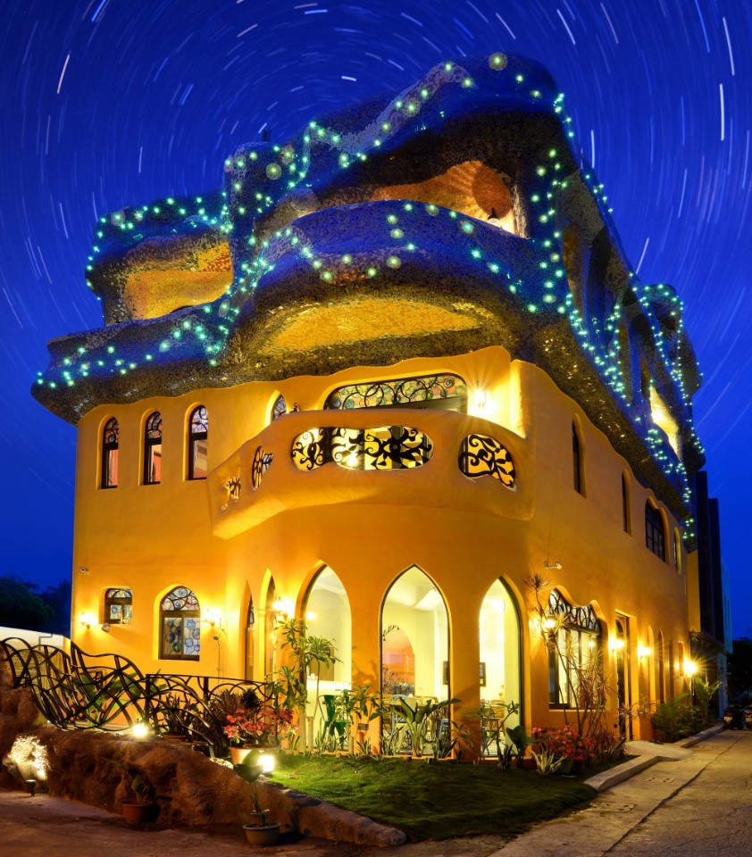 星月旅店的外觀就如其名,下層以象徵月光的金黃色為底,上層則是星夜的濃烈藍色與白色星點,整體突破既有建築定式,呈現不規則的溫潤圓角,很有繪本感;內裡裝潢則走西班牙異域style,融合海島的熱情活力與慵懶,每一種套房都有不同風格,另有早餐、午茶與泳池等設施,放逐自我的度假首選,非星月旅店莫屬。