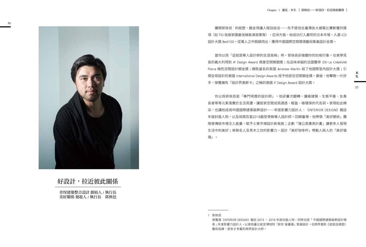 例如洛本天津仁波切藉由創立噶瑪噶居寺的索薪展開木生的旅程、當代藝術家楊納超現實主義中萬物與人的作品、多才多藝的跨界設計師郭俠邑的《蒲公英書席計畫》,讓更多人發現生活中的美好、百年木工家族第二代經營者周敬堯、江文義與葉武東的專訪中見證臺灣一甲子家具產業的興衰變革,以及如何走向國際舞台的歷程、侯世光博士投入木作技藝傳承敎育超過20年,讓台灣家具設計與技術被全世界看見等。書尾章節更讓人從11位創新設計的新世代創作者中,體會到一股不容小覷翻轉世界的設計新勢力正在蔓延。
