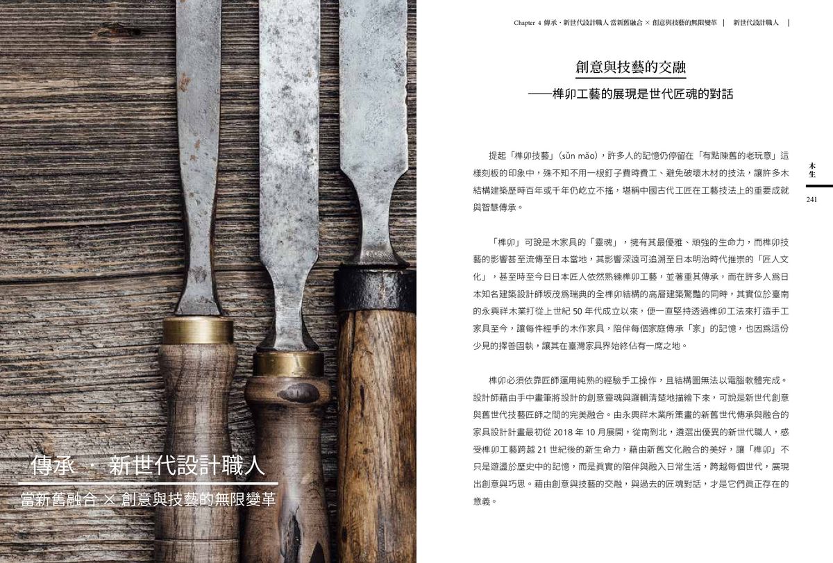 為了歡慶永興家具60週年,永興家具旗下的青風編輯部與出版商樂木文化有限公司展開合作,希望能推出一本具有紀念意義的書籍,內容重點有別於以往其他廠商主打企業品牌介紹及推廣,而是將焦點放在與「木」相關的人事物上,歷經2年努力,全書終於完成並於日前上架銷售。書名取為:「木生—一流匠人教你從零開始學木作 ╳匠人與他們的原木生活」,書中專訪43位不同領域的木藝家、設計師、百年木匠家族為題材的深度報導,剖析每位哲匠的人文思維,更有代代相傳的匠人俚語,從思維中窺探難能可貴的匠人智慧,可謂新舊世代傳承的重要參考。