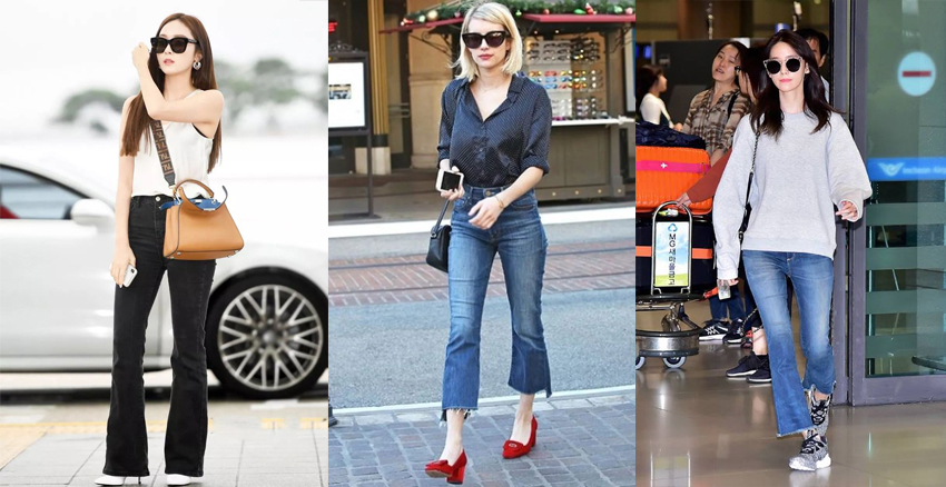 站立時、膝蓋無法併攏的「O型」腿,可以選擇小喇叭褲來修飾腿型,選擇合身不緊身的款式、顯瘦效果更好。小隻女還可以學Emma Roberts(中)及潤娥,選擇8分褲長露出纖細腳踝,搭配有根的高跟鞋或球鞋都好看;或學潔西卡(左)把褲腳放長,遮住高跟鞋背,襯得腿又直又長。