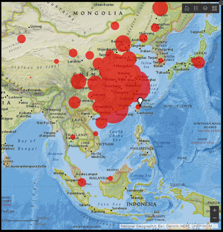 逢甲大學地理資訊中心GIS專業資訊人員自主開發的「武漢肺炎疫情地圖 臺灣版」,採用ArcGIS Online製作出串接資料的互動式地圖。