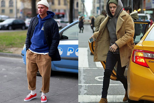 在下半身的搭配上,可以選擇時下流行的寬褲打造出寬鬆舒適的休閒風,亦可以在鞋襪上稍微著墨,讓整體造型更加分。較為保守的型男也可以選擇合身褲款,打造上寬下窄的對比感。