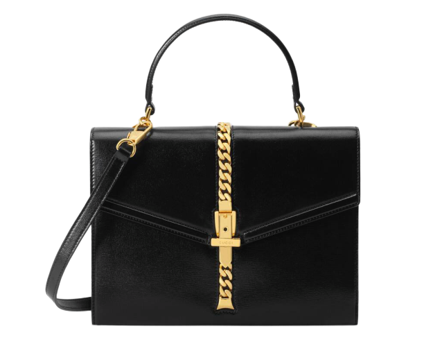 揮別過於繁複的設計細節,Gucci創意總監Alessandro Michele偶爾還是會有極簡風創作,但這極簡並非無聊,而是延續品牌經典復古形象的優雅簡斂。粗曠金鏈點綴在信封式手提包上,給人一種幹練女強人氛圍,若再搭配上黑長褲與尖頭跟鞋一起著用,保證讓你無懈可擊!