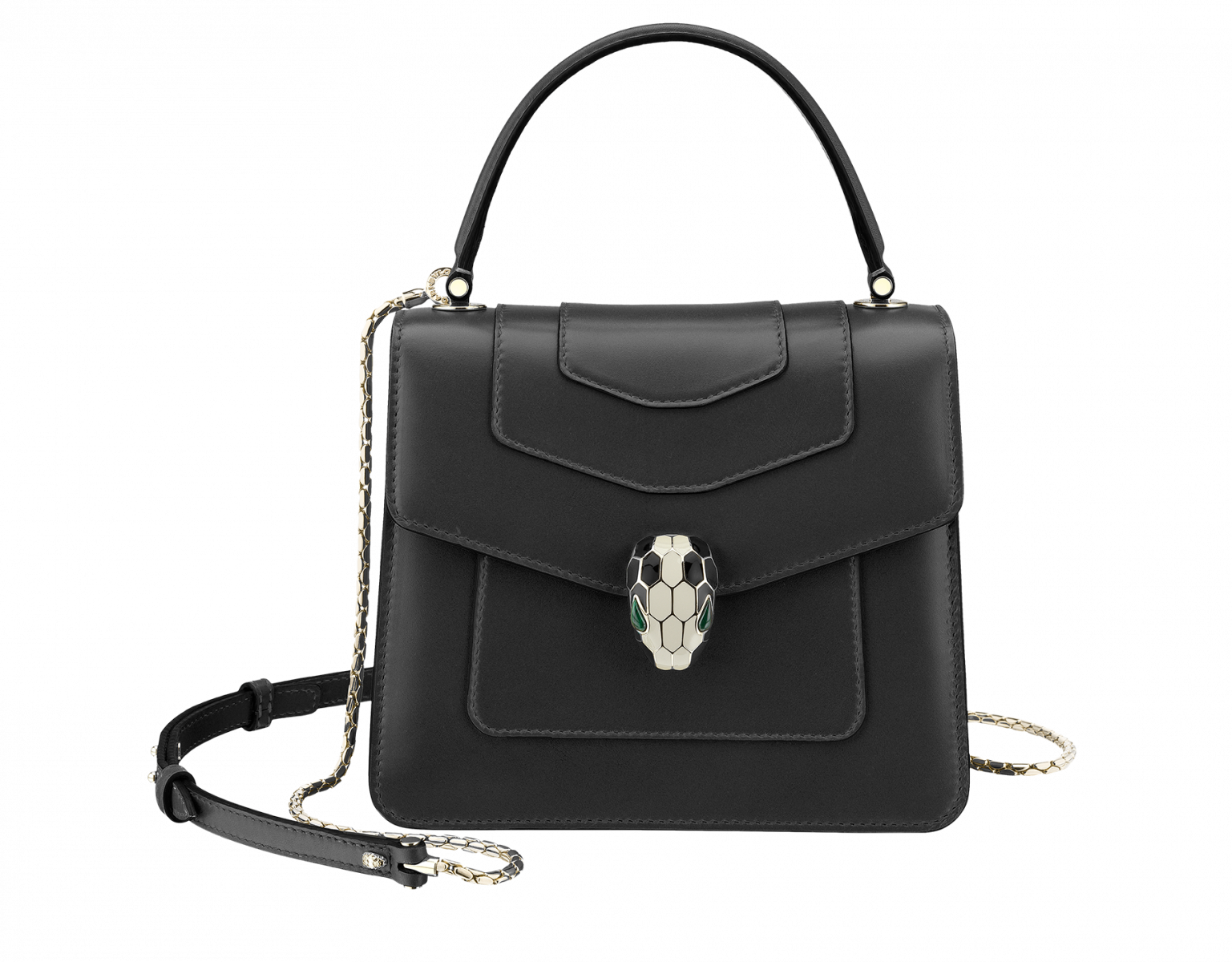 Bvlgari經典蛇頭包是許多女孩夢寐以求的精品包,過去比較常見的款式,大多是金屬光或是飽和色,但其實低調內斂的黑色皮革點綴蛇頭釦鎖和銀鍊設計,不會過於大鳴大放很適合都會女性使用。