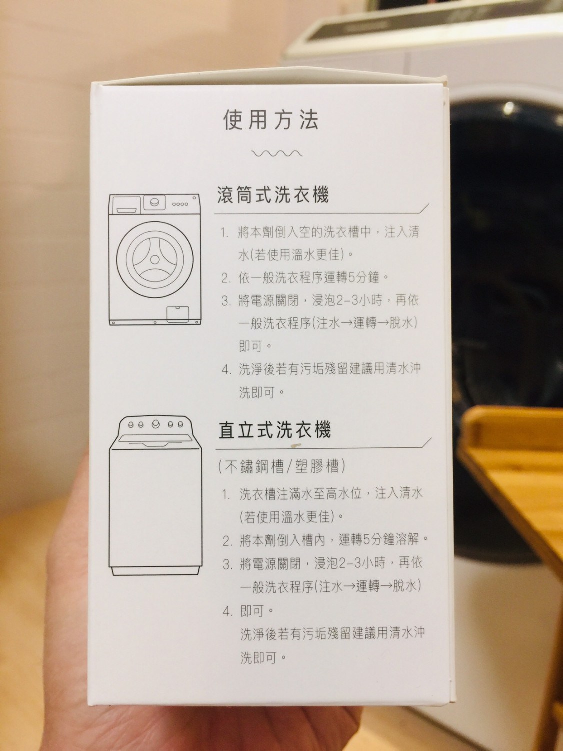使用方式相當簡單,跟一般市售的洗衣機洗劑相同,基本上就是注滿水->倒入洗劑->稍微運轉幾分鐘->靜置2~3小時->再以正常洗衣程序跑一次就ok!