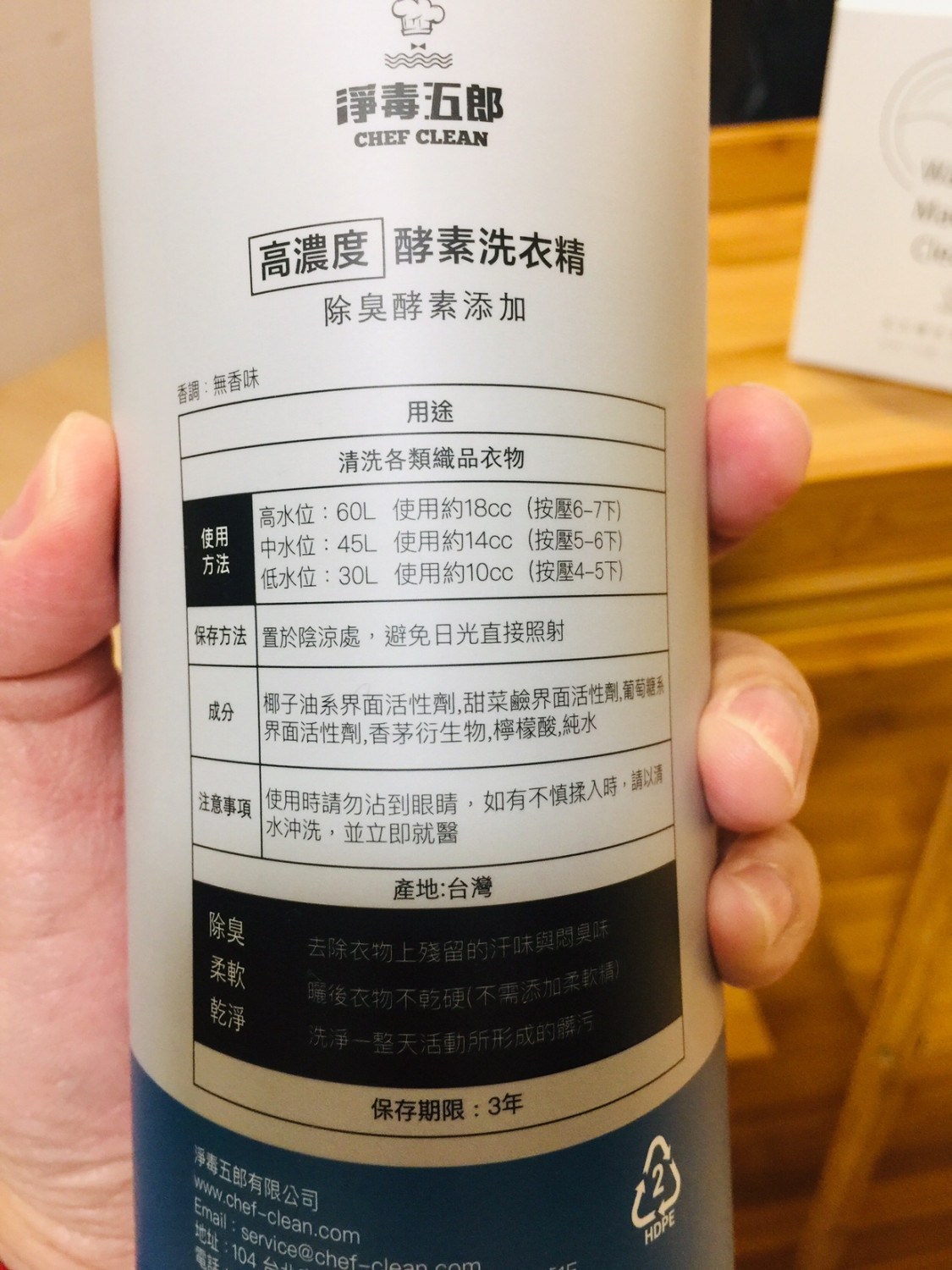 這款淨毒五郎品牌是艾瑪先自己在網路上發現它的蔬果洗潔劑,後來用過不錯,就想說也試試看它的高濃度酵素洗衣精,除了成分來