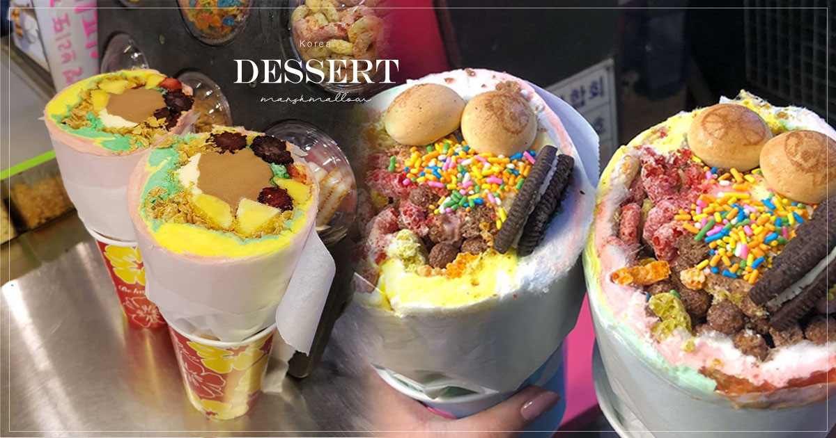 棉花糖捲餅光是外表就超吸引人,粉嫩的棉花糖外皮中間包著冰淇淋、水果乾或麥片,捲起來後在頂部撒上巧克力米、淋上糖漿!完全就是超罪惡的組合,但看起來真的有夠少女,馬上就在韓國掀起旋風啦~