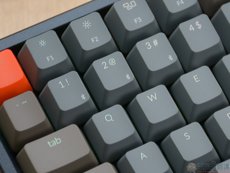 Keychron K4 最多可與三款裝置配對,你可以看到在按鍵 1、2、3 的右下角有小小的藍牙圖示,而這三個按鍵也是儲存與切換相應藍牙配對裝置的記憶鍵。