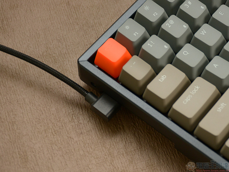 延續 Keychron 的優良傳統,K4 同樣可支援有線與無線藍牙連接使用。隨盒附的線材為 L 型接頭 USB-C,有別於直式接頭更省桌面空間,不會出現凹折的情況,貼合鍵盤側邊看起來更順眼。如果你要充電或是採用有線模式連接電腦,只需透過這個 USB-C 連接埠就能做到。