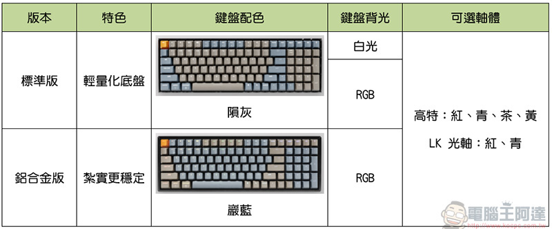 鍵盤材質有鋁合金與標準版兩種選擇,其中標準版還有分為 RGB 與白光兩種鍵盤背光,鋁合金版則僅有 RGB 背光一種。配色部分標準版採用中間隕灰的鍵帽色彩,鋁合金版則為中間巖藍。共計 18 種款式,下面筆者簡單整理重點,大家會更清楚: