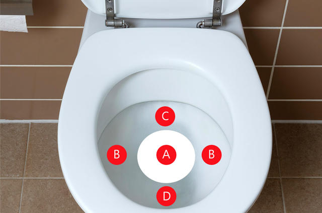 根據節目中的實驗發現,瞄準 A 處「對著馬桶水尿」,再一次排尿的過程會造成「372滴」尿液飛濺,以男性平均一日排尿七次計算,則一整天站著尿尿就會造成「約2600滴」尿液噴濺。