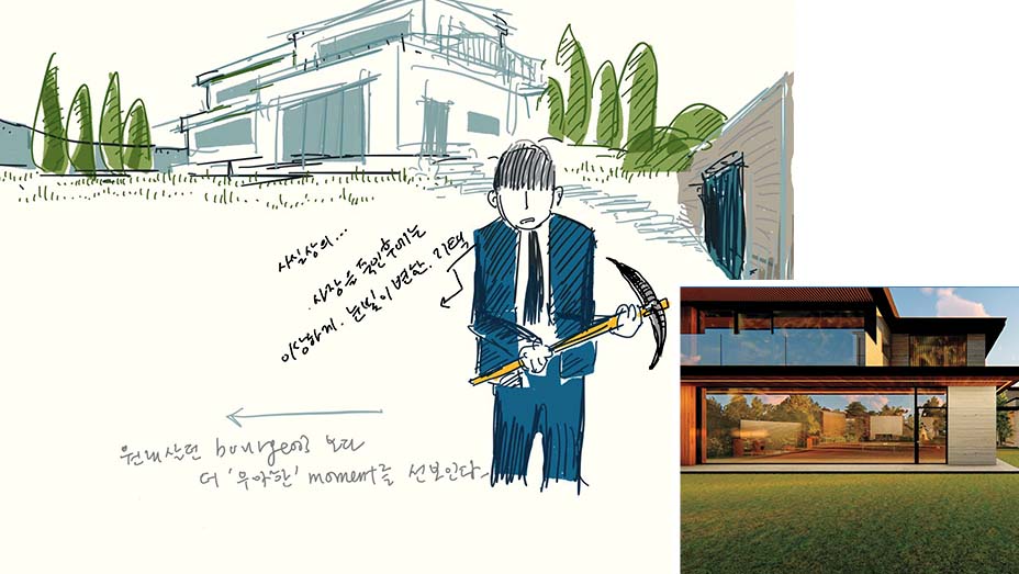 儘管最後沒有手拿十字鎬的人出現,但劇本創作早期手繪出來的朴家大宅,幾乎與後期拍攝時呈現的一模一樣,奉俊昊當時甚至還沒想到花園裡會發生什麼事。