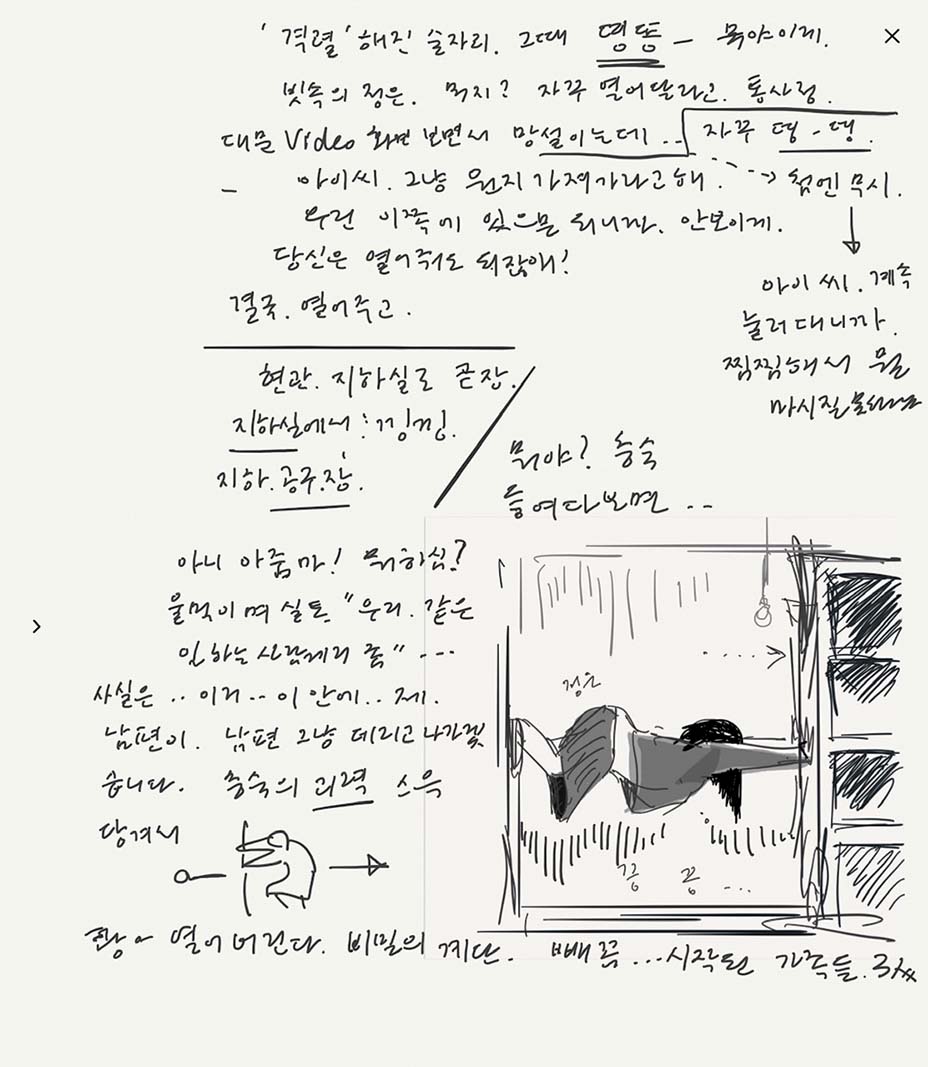 這張草圖可說是《寄生上流》的最大轉折,金家母親忠淑下樓查看被解雇的前管家時,赫然發現她正試圖進入一個神秘地下室。奉俊昊說:「那些看過電影的人會立馬知道這幕發生了什麼事,當我在撰寫劇本想出這個畫面時,我簡直興奮極了。」