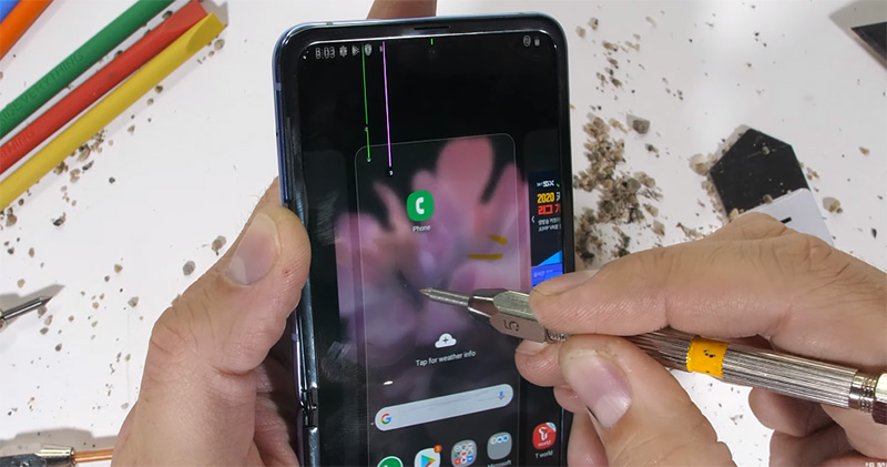 反向彎折測試方面 Galaxy Z Flip 確實擁有非常強壯的轉軸機構,即便螢幕已經因施力而翹起,外殼因施力而破裂,轉軸方面依然可以正常作動。