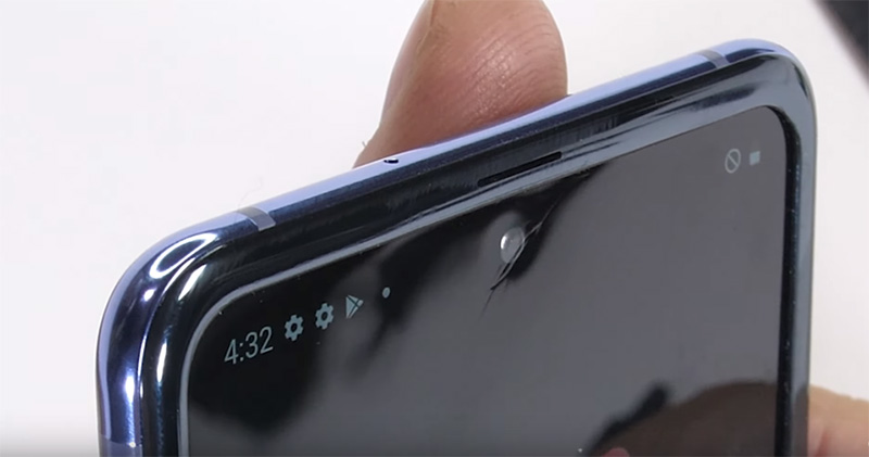 在螢幕方面,在開機時即有提示請輕柔觸控螢幕,不要重壓。在刮擦測試前先說明了硬度 2 是塑膠筆頭,而硬度 10 則是鑽石筆頭,雖然這回 Samsung 標榜了是 UTG 材質,但卻在硬度 2 時就已經對其造成損傷,甚至測試者用指甲都能對螢幕造成傷害,因此測試人員也對 UTG 到底是不是真正的玻璃一事感到疑惑。