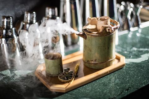 竹子造型的茶壺中置入乾冰,形似燒開的茶壺,在琴酒中集合了甘蔗、紫蘇、肉桂等香氣,剛入口便能感受到的甘蔗清甜味道,入喉後則留存綠茶的清香,清爽的讓人意猶未盡!可搭配果乾食用。