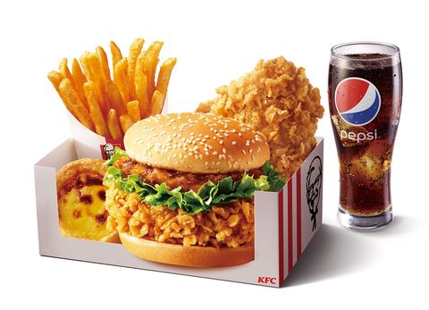 ■ 熱炒三杯咔啦雞腿堡x1份、咔啦雞腿堡x1份、香酥脆薯(中)x1份、4塊上校雞塊x1份、勁爆雞米花(大)x份、附餐$32中杯飲品x1杯