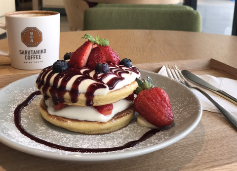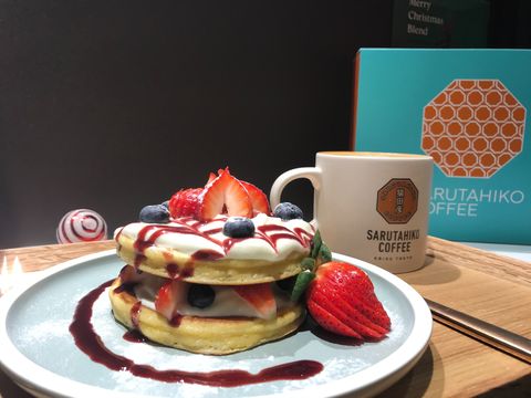 由日籍專業咖啡師駐店的猿田彥珈琲於台中三井、園道店推出限定「草莓壽太郎鬆餅」,鬆軟綿密的現煎鬆餅搭配新鮮草莓與特調醬汁點綴,每一口都能嚐到濃濃愛戀。